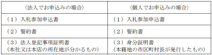 「入札参加申込書」に必要事項を記入し、必要書類を添えて持参するか、郵送によりお申し込みください。■必要書類